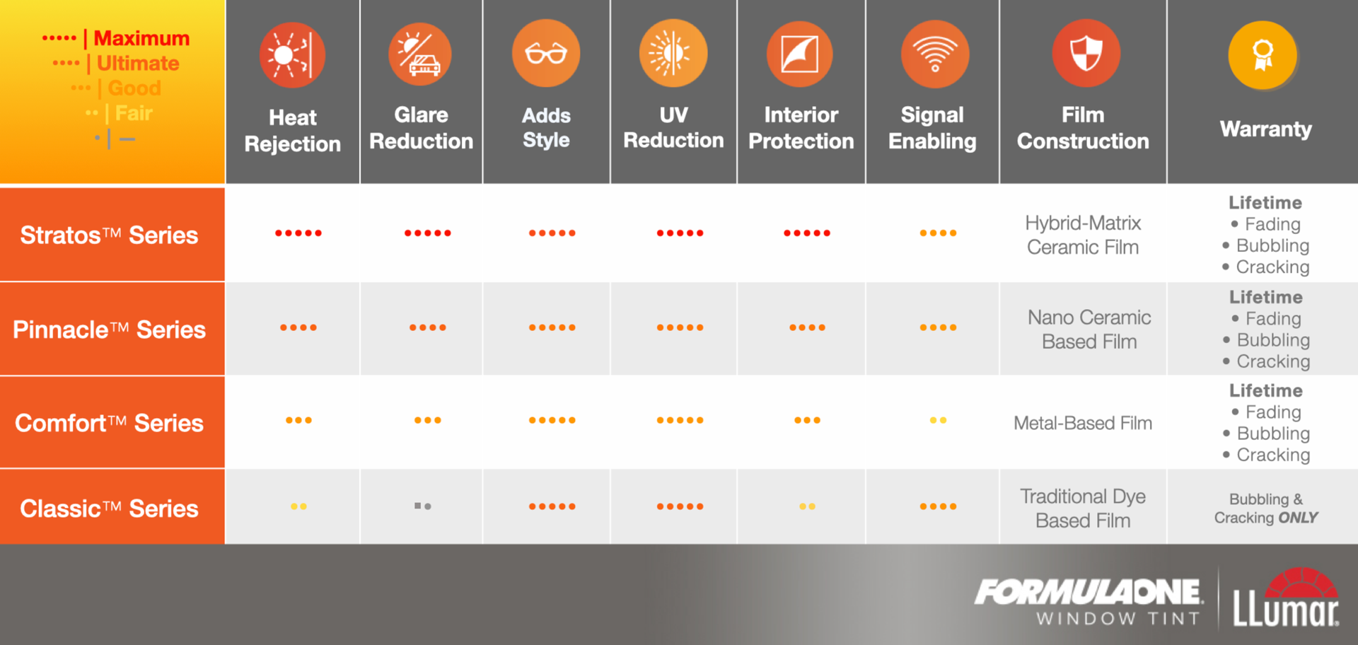 Engineered to deliver a higher standard of performance, LLumar window tint is known for its quality, color stability, and durable scratch-resistant coating. Benefits of window tinting include heat, UV, and glare rejection. LLumar’s non-metalized ceramic window tint maximizes these benefits without interfering with your keyless entry, radar detector, mobile phone, and other radio frequency technology you rely on in your vehicle.